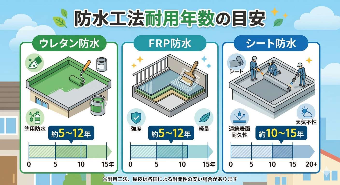 主な防水工法の耐用年数の目安は以下の通りです。