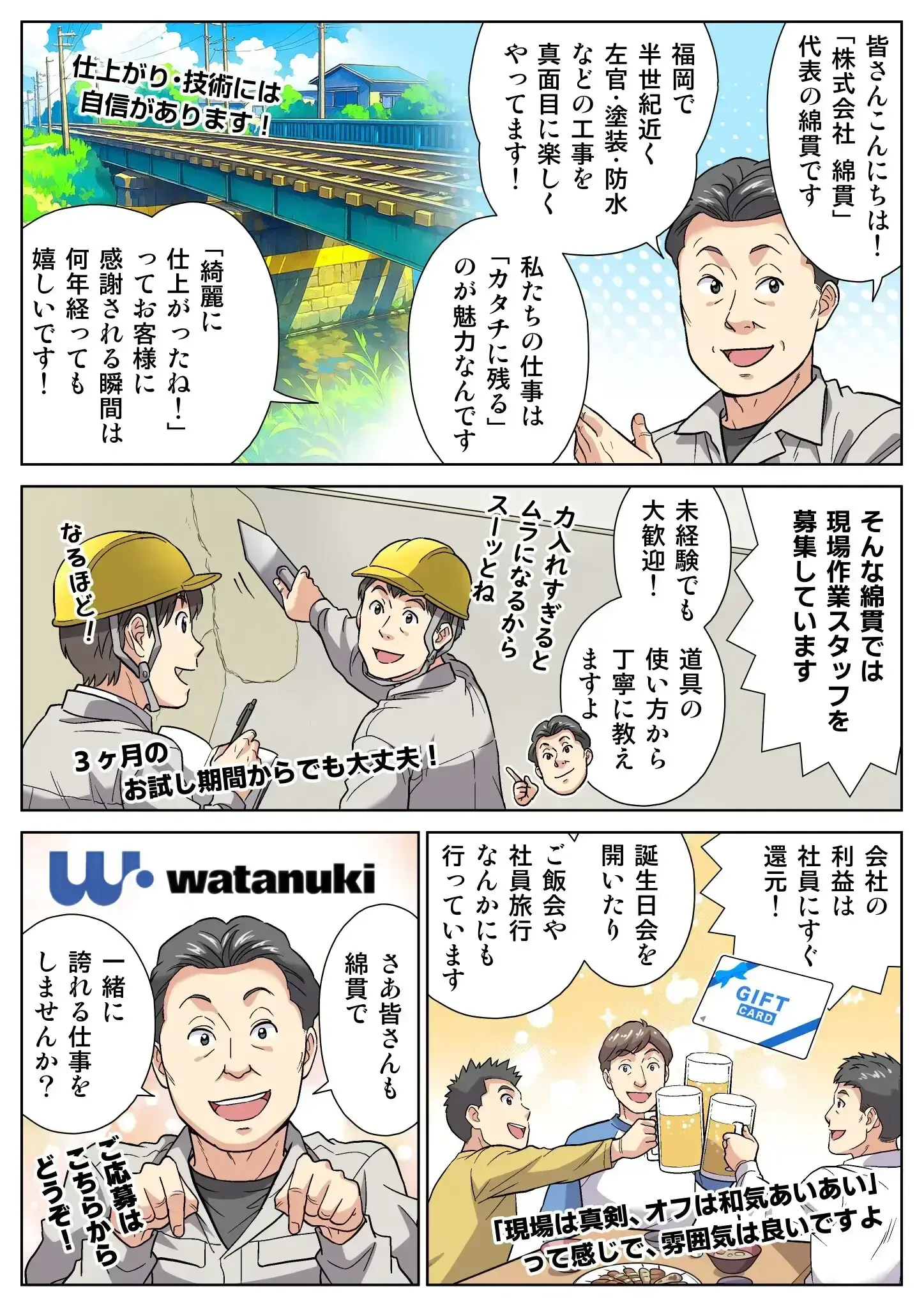 作業前に全員で朝礼を行い、その日の作業内容や注意点を確認します。